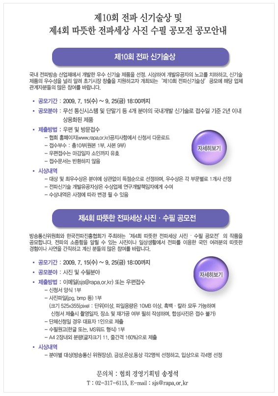 제10회 전파 신기술상 및 제4회 따뜻한 전파세상 사진 수필 공모전 공모안내 국내 전파방송 산업체에서 개발한 우수 신기술 제품을 선정·시상하여 개발유공자의 노고를 치하하고, 신기술 제품의 우수성을 널리 알려 초기시장 창출을 지원하고자 개최되는 '제10회 전파신기술상' 공모에 해당 업체 관계자분들의 많은 참여를 바랍니다. </br> 또한, 방송통신위원회와 한국전파진흥협회가 주최하는 '제4회 따뜻한 전파세상 사진, 수필 공모전'의 작품을 공모합니다. 전파의 소중함을 알릴 수 있는 사진이나 일상생활에서 전파를 이용한 국민 여러분의 따뜻한 경험이나 사연을 간직하고 계신 분들의 많은 참여를 바랍니다. </br> </br> ※ 자세한 내용은 첨부파일을 참고하시기 바랍니다. |