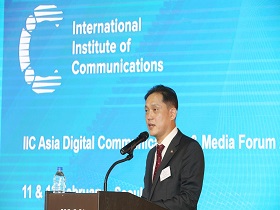 KCC Vice Chairperson Kim Tae-kyu delivered a welcome speech at the forum that was hosted by the International Institute of Communications (IIC), which was established in 1969 to analyze international broadcasting and telecommunications trends and promote cooperation.
